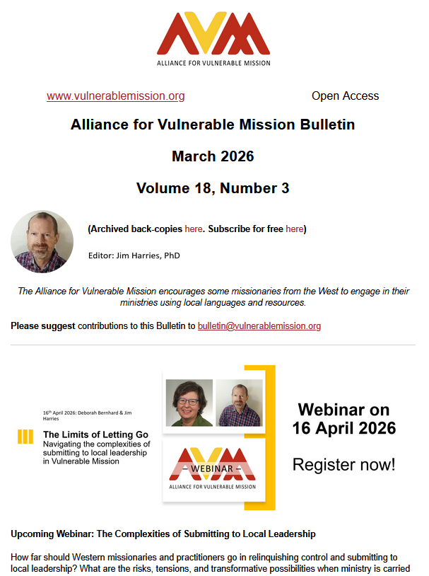 Wir verschicken monatlich ein Bulletin per Email. Darin enthalten sind Nachrichten, Veranstaltungshinweise, Artikel und andere Ressourcen zum Thema Verletzliche Mission. Die neueste Ausgabe kann durch diesen Link abgerufen werden.